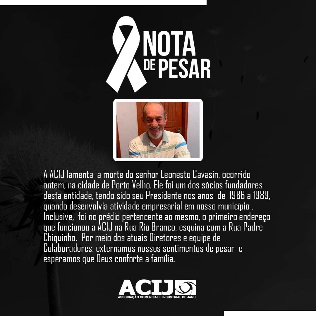 A ACIJ lamenta a morte do senhor Leonesto Cavasin, ocorrido ontem, na cidade de Porto Velho. Ele foi um dos sócios fundadores desta entidade, tendo sido seu Presidente nos anos de 1986 a 1989, quando desenvolvia atividade empresarial em nosso município . Inclusive, foi no prédio pertencente ao mesmo, o primeiro endereço que funcionou a ACIJ na Rua Rio Branco, esquina com a Rua Padre Chiquinho. Por meio dos atuais Diretores e equipe de Colaboradores, externamos nossos sentimentos de pesar e esperamos que Deus conforte a família.