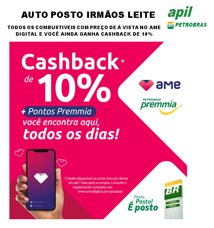 Uma incrível promoção do Auto Posto Irmãos Leite em parceria com AME Digital, todos os combustíveis com preço de vista, você ganha Cashback de 10% e ainda pontua no Premmia.