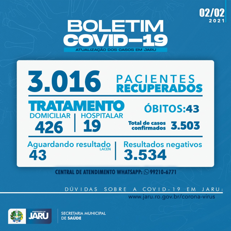 Sendo que desse total, 3.016 pessoas já se recuperaram, e 444 estão ativos. 19 precisaram ser internados e 426 realizam o tratamento em casa.