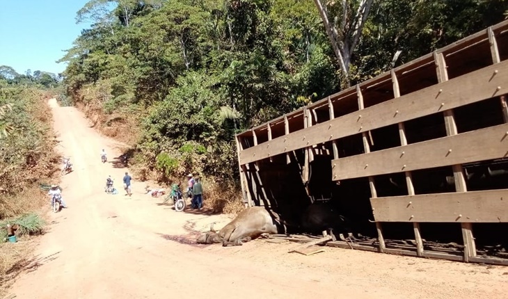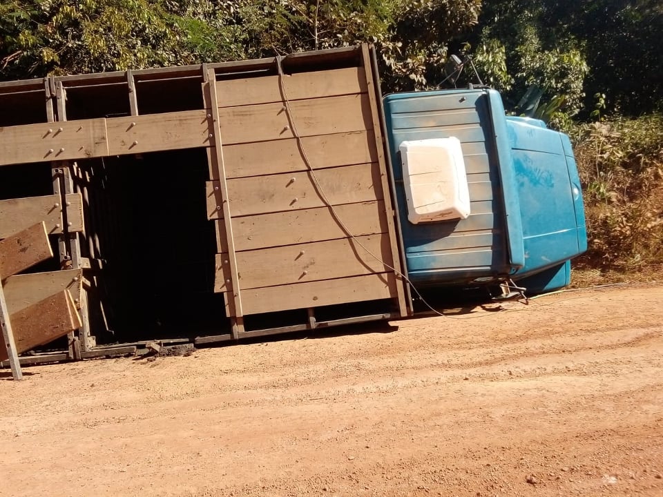 Um caminhão Mercedes-Benz/2224 boiadeiro carregado com 18 vacas tombou na noite desta quinta-feira (08), em um morro na eletrônica que liga o travessão C- 70 com C-74, zona rural de Vale do Anari-RO.
