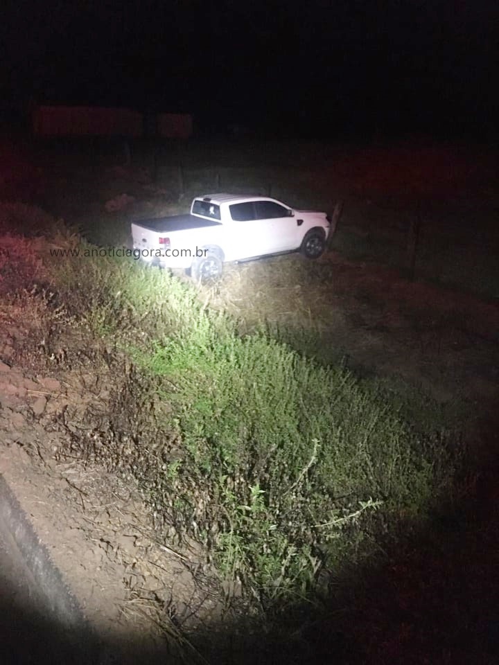 A camionete foi abandonada ligada e com os faróis acessos na lateral da RO 133, e provavelmente o bandido perdeu o controle do veículo saindo da pista e colidiu em uma lasca da cerca de uma propriedade, causando uma amassado no para choque dianteiro lado direito. Ninguém foi encontrado no local.