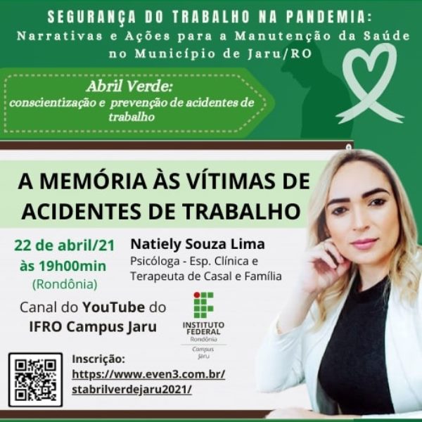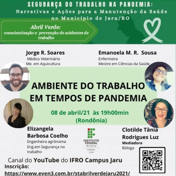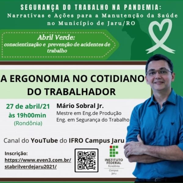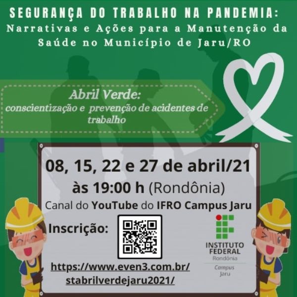 O Instituto Federal de Educação, Ciência e Tecnologia de Rondônia (IFRO), Campus Jaru, está com inscrições abertas para o Abril Verde. No evento serão abordados temas relacionados à Segurança e Saúde no Trabalho. Realizado de 8 a 27 de abril de 2021, em ambiente on-line, o evento este ano tem como tema: “Segurança do Trabalho na Pandemia: Narrativas e Ações para a Manutenção da Saúde no Município de Jaru/RO”.