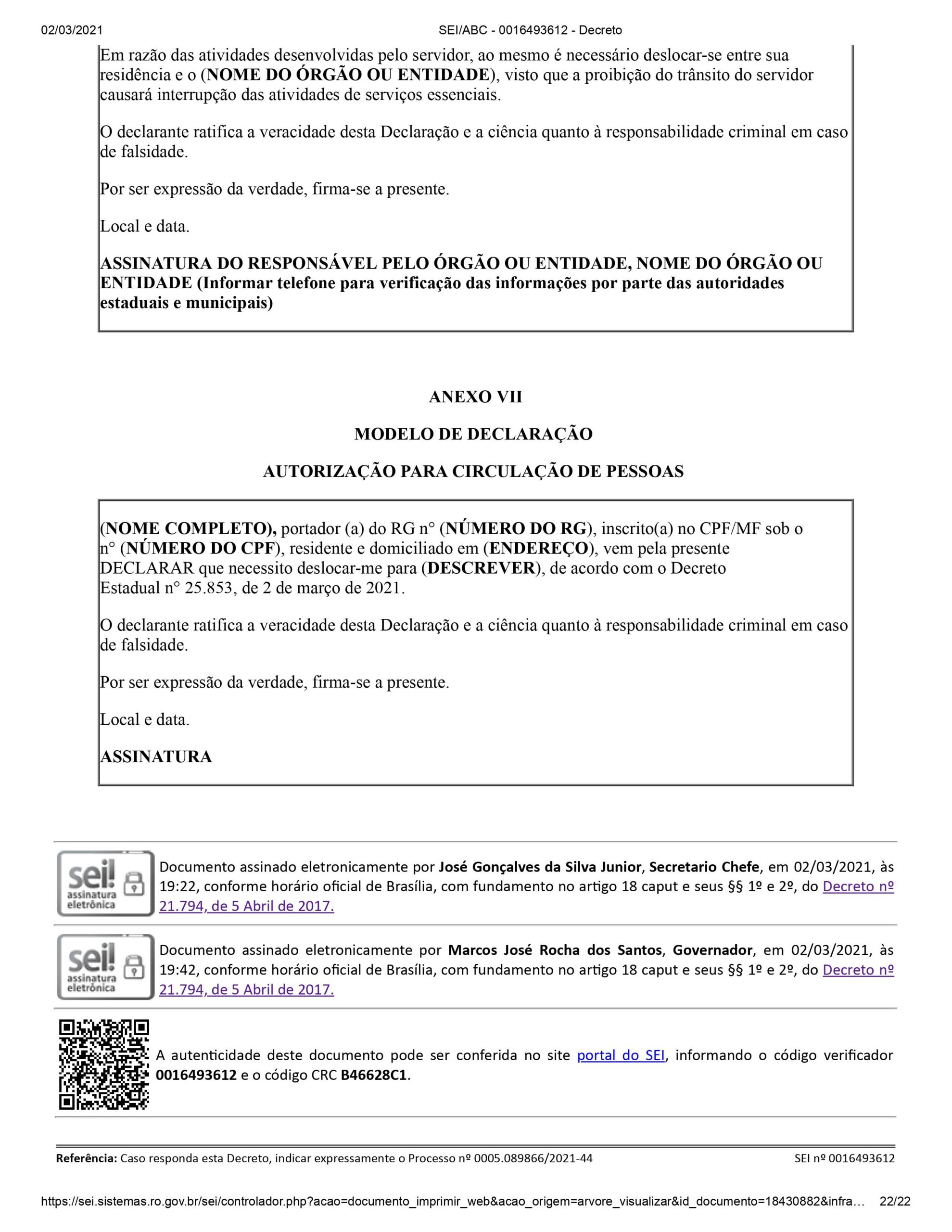 Aqueles que eventualmente precisem sair de casa entre às 21h e 6h, são obrigados a apresentar uma declaração, que pode ser feita de próprio punho com a justificativa da saída, impressa ou gerada eletronicamente e salva no celular. O modelo de declaração está disponível no site da Sefin. Clique aqui para acessar.