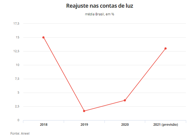Atualmente, informou ele, a estimativa da agência é que o aumento médio fique em 13% em 2021. Esse percentual cairia para 8% com a devolução aos consumidores de uma parte dos R$ 50 bilhões em impostos cobrados a mais nas contas de luz nos últimos anos.