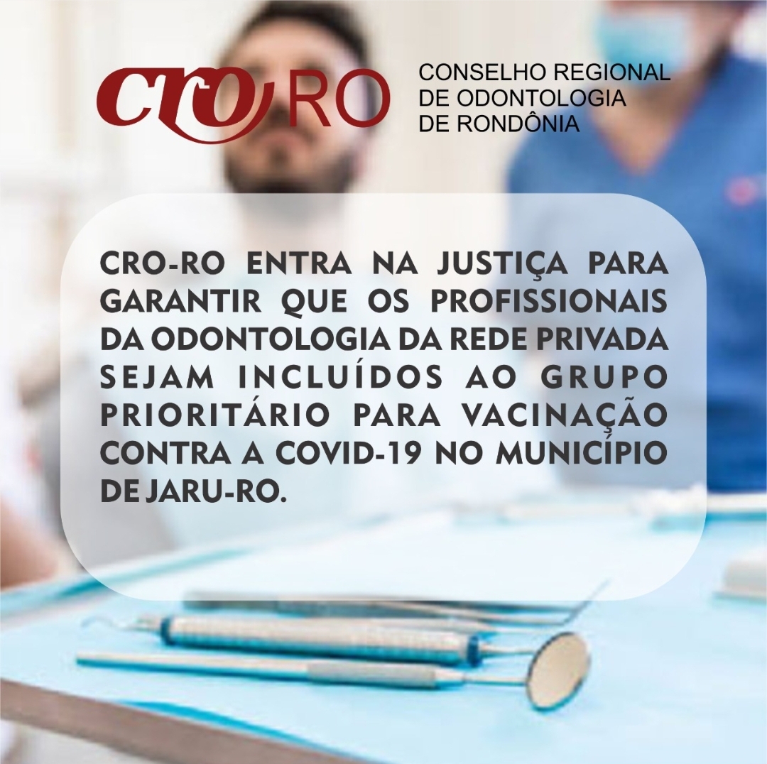 O Conselho Regional de Odontologia de Rondônia informa que entrou na justiça para garantir que os profissionais da Odontologia da rede privada, do município de Jaru-RO, sejam incluídos ao grupo prioritário para vacinação contra a covid-19, conforme estabelecido pelo Ministério da Saúde no Sistema de Informação do Programa Nacional de Imunizações.