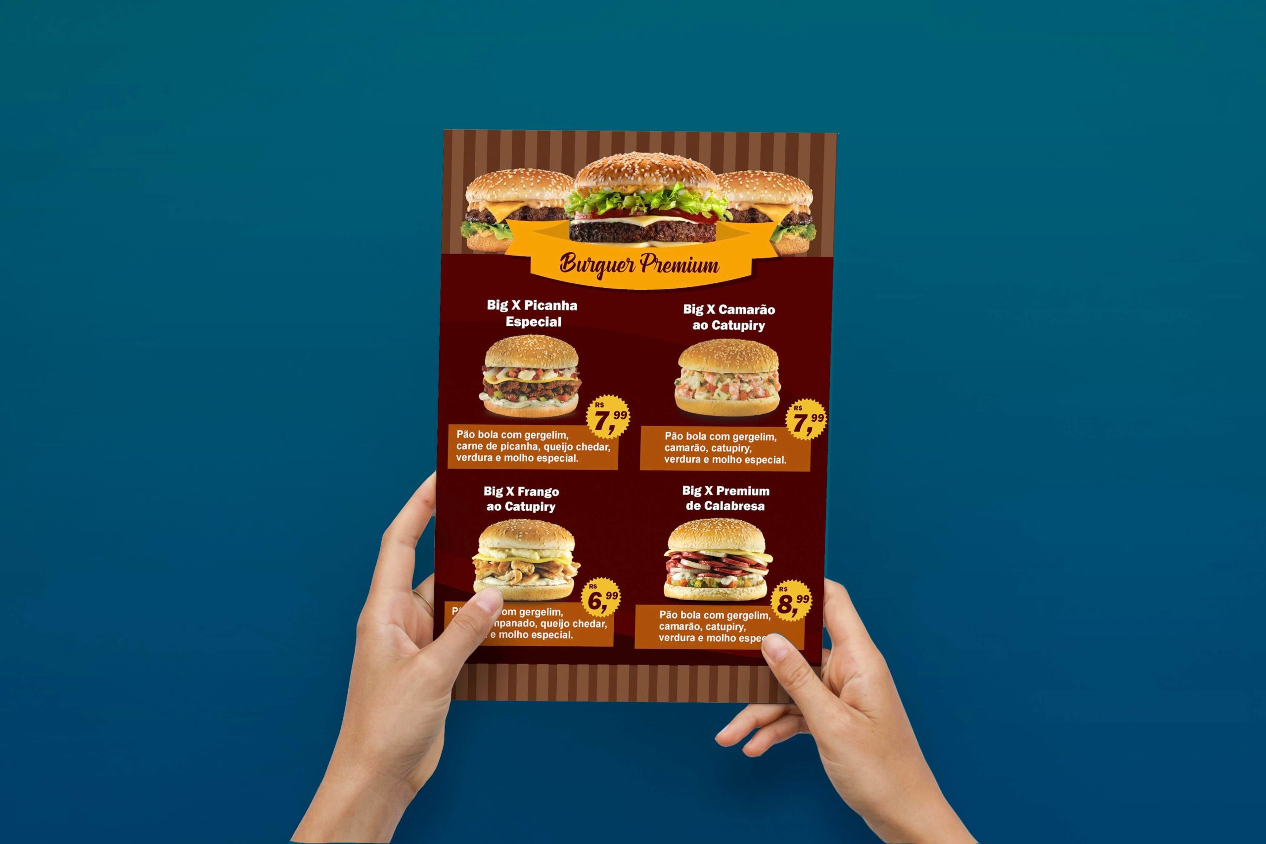 - Cardápio de folha única: perfeito para lanchonetes que não possuem muitas opções de bebidas, lanches e sobremesas feitas com balde de Nutella.