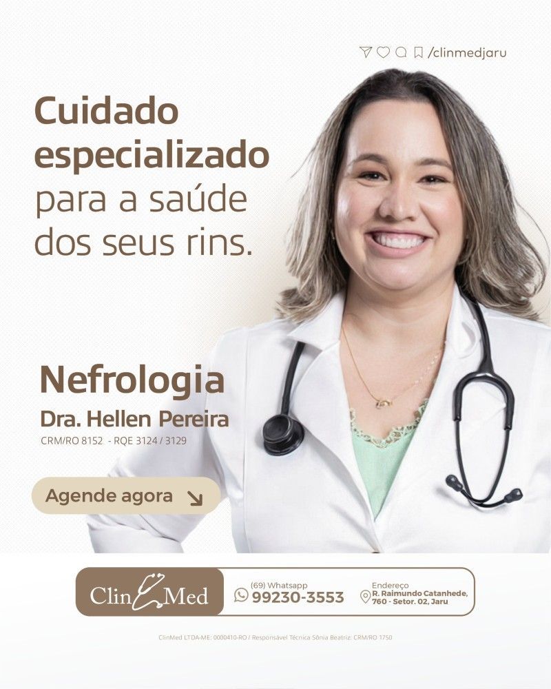A Clin Med traz para Jaru atendimento especializado em nefrologia com a Dra. Hellen Pereira. Com ampla experiência na área, a médica atende pacientes com doenças renais, garantindo um acompanhamento cuidadoso e eficiente.
