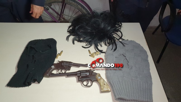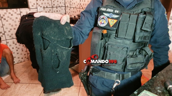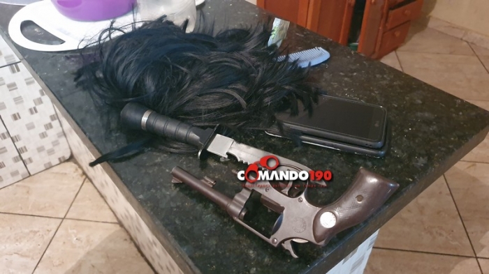 Quando ele avistou a viatura se aproximando, correu para dentro da casa, com a mão na cintura. Ele foi imobilizado dentro de um quarto e em seu poder, os militares encontraram um revólver calibre 32, municiado. Além do armamento, os policiais também localizaram duas tocas ninjas, uma peruca e uma faca.