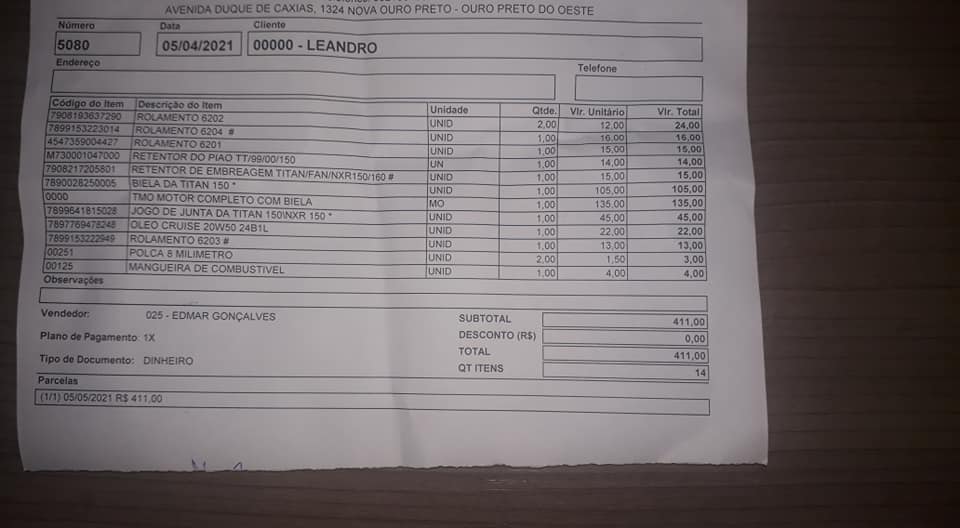 Em sua prestação de contas Leandro, informou que o conserto da motocicleta ficou em R$ 411,00 e o dinheiro referente a diferença, foi investido na compra de cestas básicas para distribuir as famílias carentes.