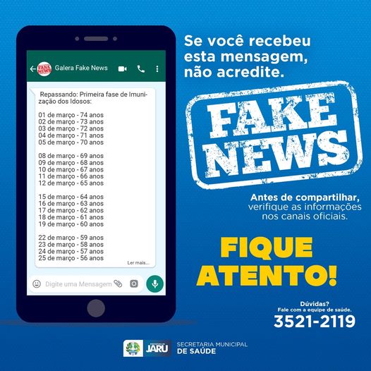 A orientação da Secretaria Municipal de Saúde de Jaru, é que o cidadão acompanhe apenas as informações divulgadas nos canais oficiais da prefeitura, Governo do Estado e Governo Federal.
