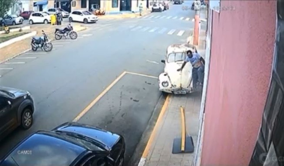 Uma câmera de segurança registrou o momento em que um homem corre após ser atropelado por um Fusca enquanto caminhava pela calçada em São Miguel Arcanjo (SP). O caso aconteceu na Rua Comendador Dante Carraro, nesta quarta-feira (5).