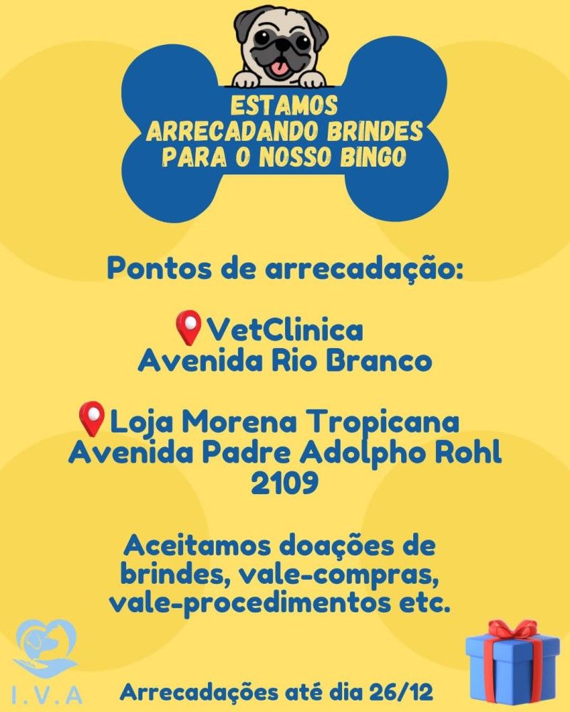 O Instituto Vitória dos Animais (IVA) está mobilizando a comunidade para a doação de brindes que serão utilizados no Bingo Beneficente, que acontecerá no dia 28 de dezembro, às 16h, no Quiosque Occas.