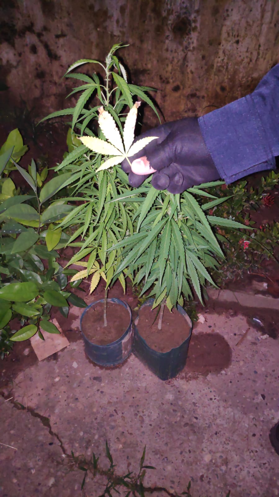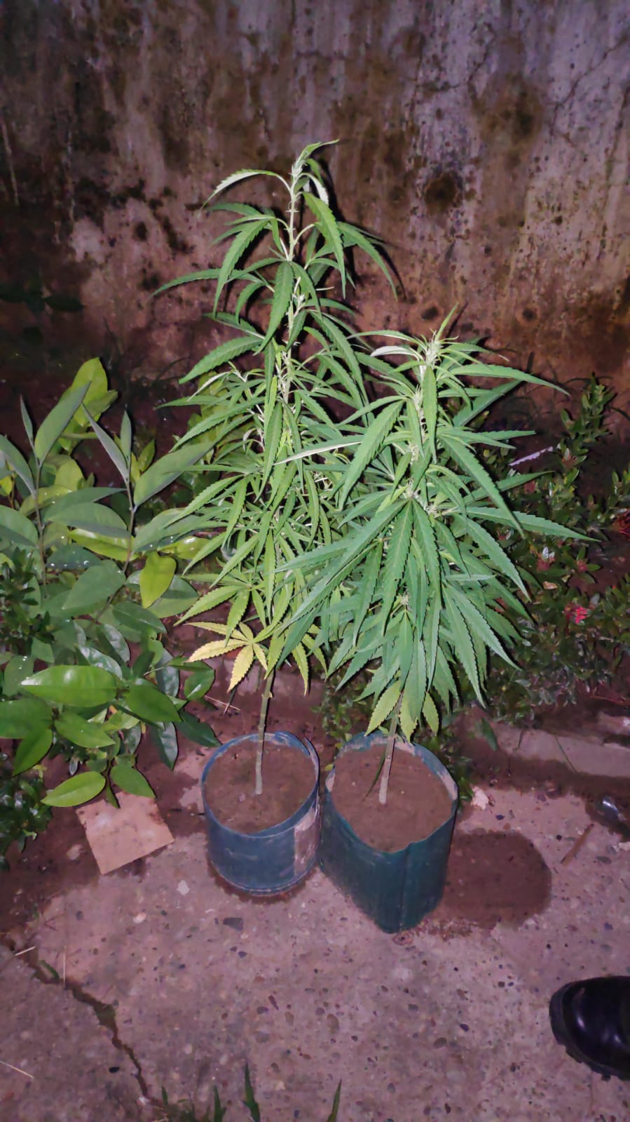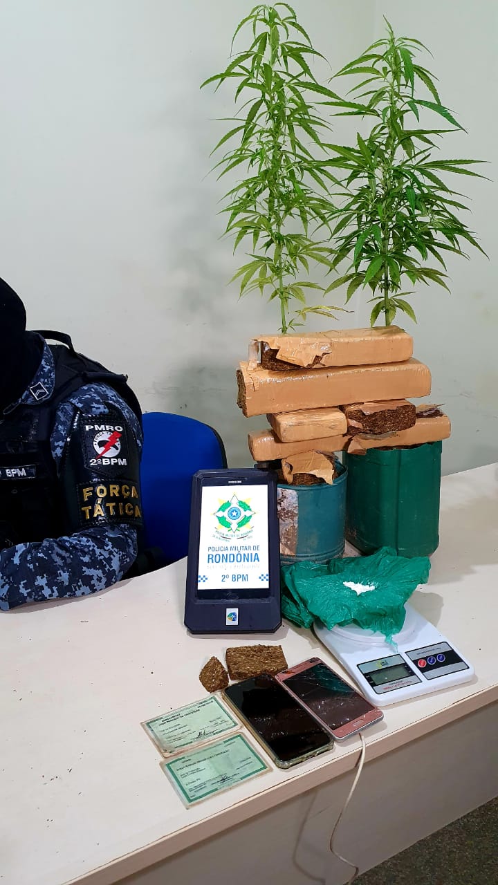 Em patrulhamento de rotina pela rua Dr. Fiel no bairro Vila Jotão no segundo distrito de Ji-Paraná, um elemento avistar a guarnição do Raio da PM, este arremessou algo para dentro de uma residência. Ao averiguar a situação, os militares encontraram tabletes de maconha, pesando 3.500Kg, e no local havia também dois pés de Cannabis, uma pequena porção de bórico e dois celulares de procedência duvidosa.