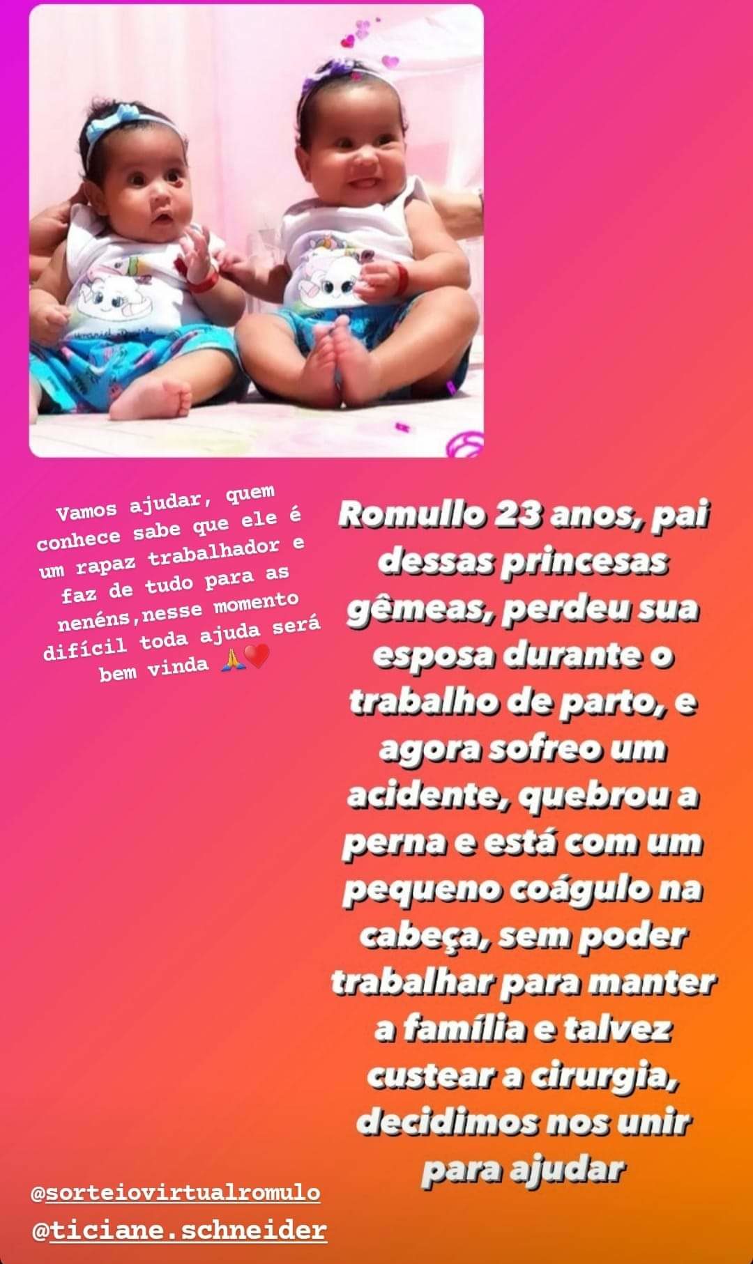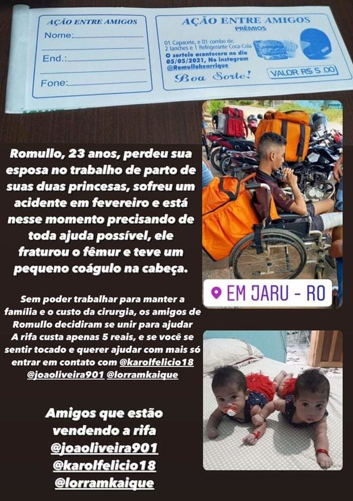 Romullo está enfrentando uma situação difícil, perdeu sua esposa durante o parto de suas filhas e em fevereiro sofreu um acidente grave de moto enquanto trabalhava como entregador, impossibilitando ele de trabalhar e sustentar sua família.