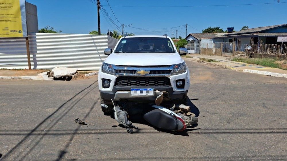 Na tarde desta segunda-feira (12), um acidente de trânsito foi registrado no cruzamento da Rua Florianópolis com a Avenida Ceará, em Jaru (RO). A colisão envolveu uma caminhonete e uma Biz.