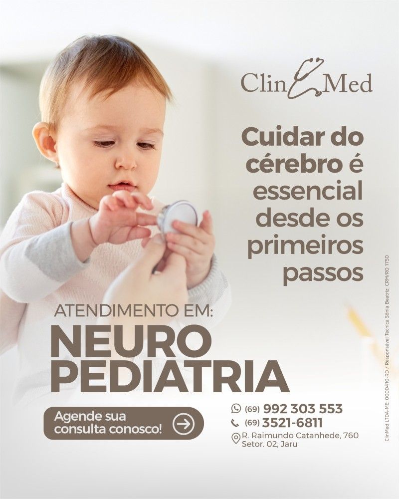A saúde infantil ganha reforço em Jaru com o atendimento especializado em Neuropediatria na Clínica Médica Clin Med. Com o lema “Cuidar do cérebro é essencial desde os primeiros passos”, a clínica destaca a importância do diagnóstico e acompanhamento neurológico desde a infância.