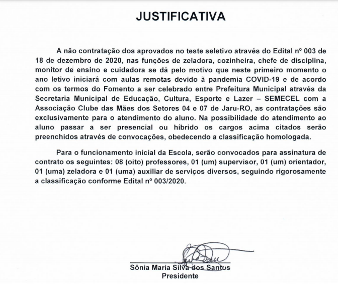 Jaru: Clube das Mães emite nota justificativa de não contratação completa Por admin postado em 4 de fevereiro de 2021 às 14:42 ERRATA alteração de datas convocação e assinatura de contrato JUSTIFICATIVA da não contratação total