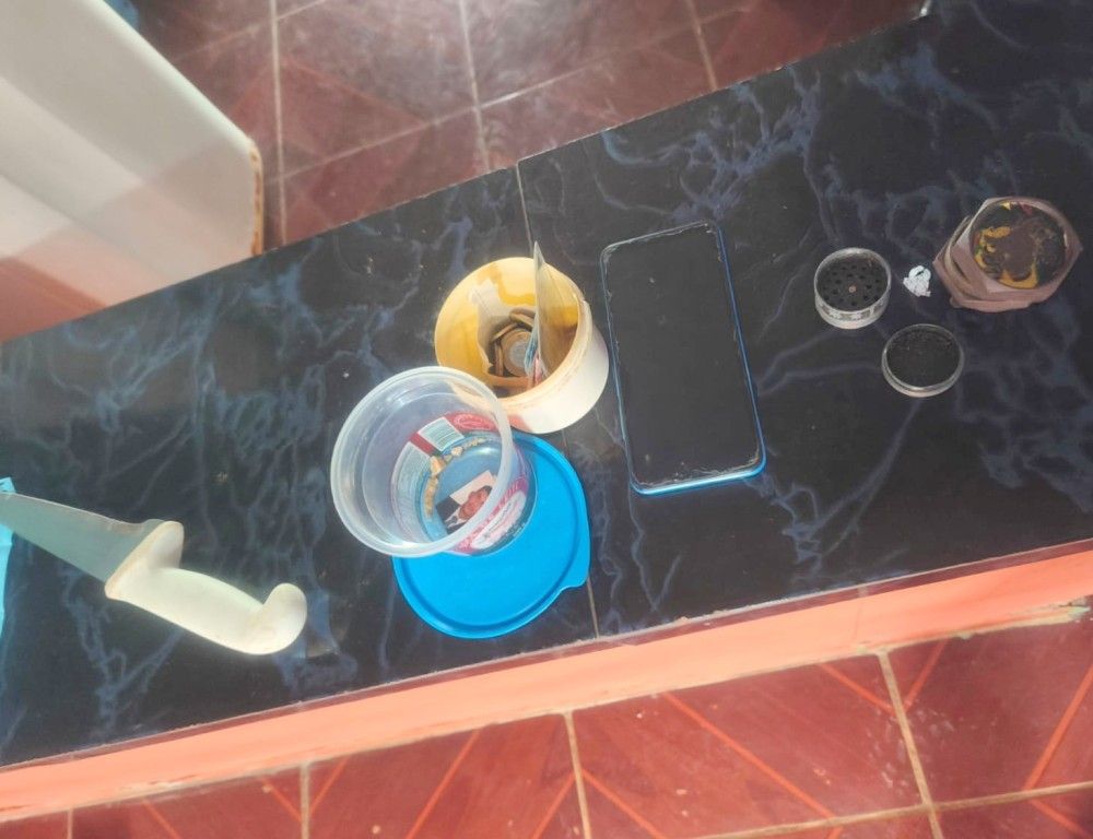 Dentro da residência, os policiais encontraram materiais relacionados ao tráfico de drogas. Em uma prateleira havia uma faca com resquícios de substância semelhante ao crack. Abaixo dela foram localizados invólucros de substância análoga à maconha e chavadores usados para o preparo do entorpecente. Em uma caneca, os policiais encontraram diversas pedras aparentando ser crack, todas embaladas de forma característica para comercialização.