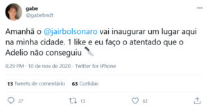 A vítima registrou ocorrência de ameaça e apenas passou o primeiro nome e o endereço do agressor. A Polícia vai buscar identificá-lo e ouvi-lo sobre a denúncia. Não há mais informações.