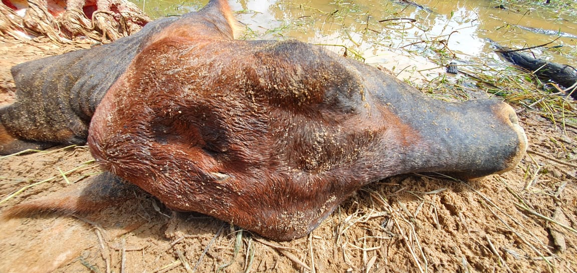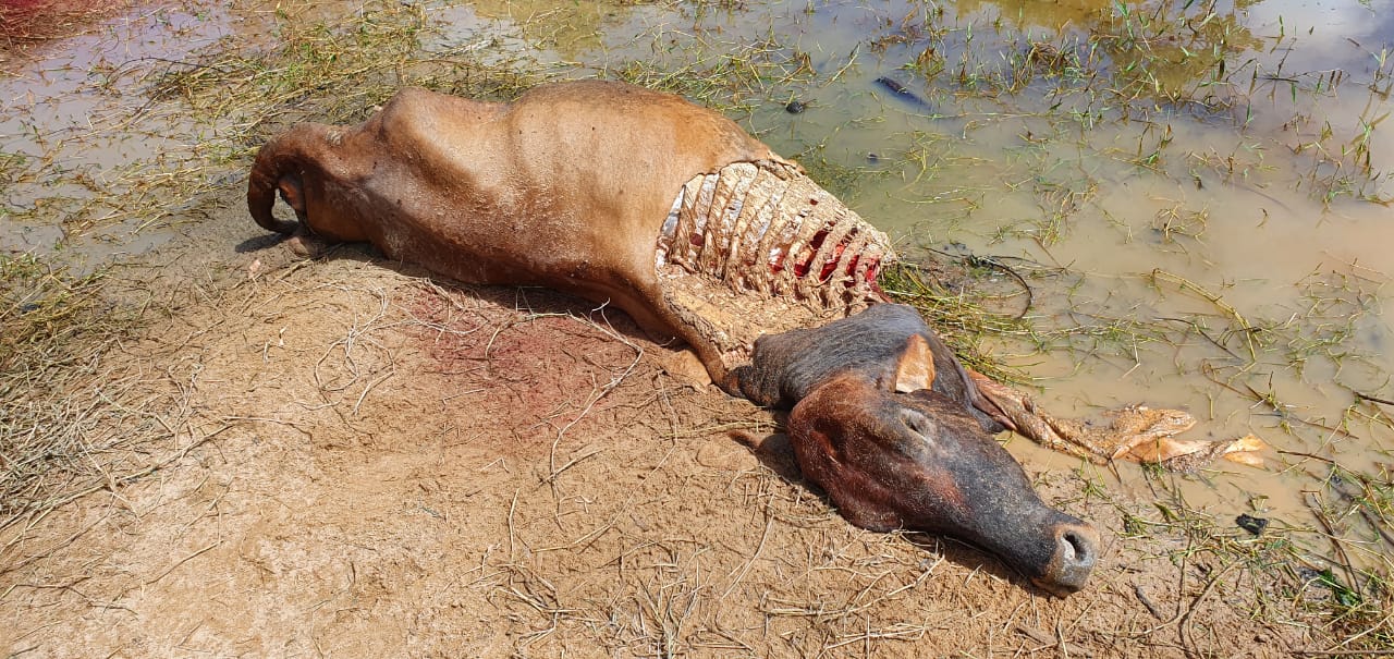A vaca estava com uma perfuração na cabeça e os quartos e a paleta haviam sido retirados do animal. Ele ainda identificou um pé de chinelo da marca Coca Cola abandonado no local