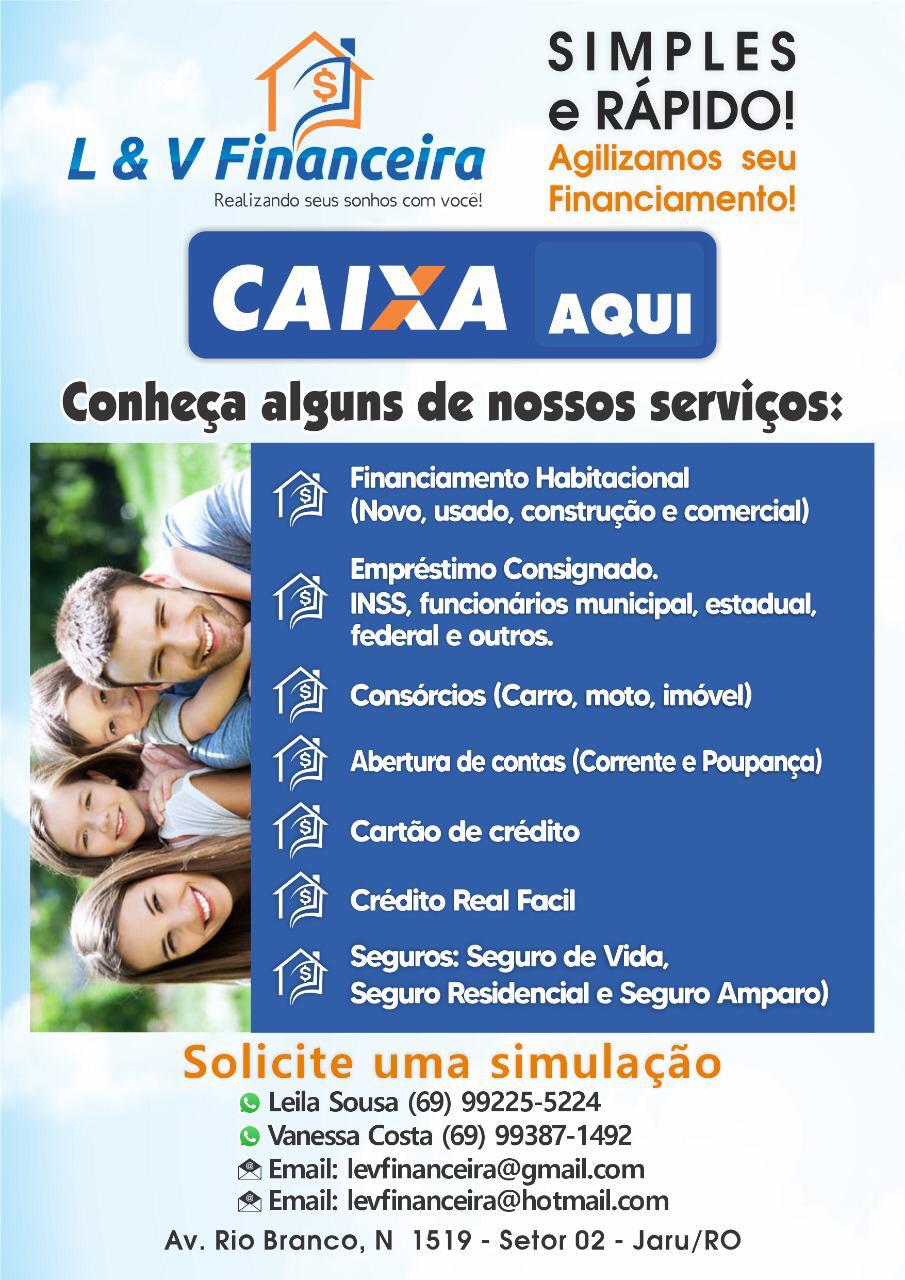 Agora você de Jaru e toda a região, pode contar com a mais nova loja financiamentos. A L & V financeira é uma loja correspondente da Caixa Econômica especializada nos serviços de:
