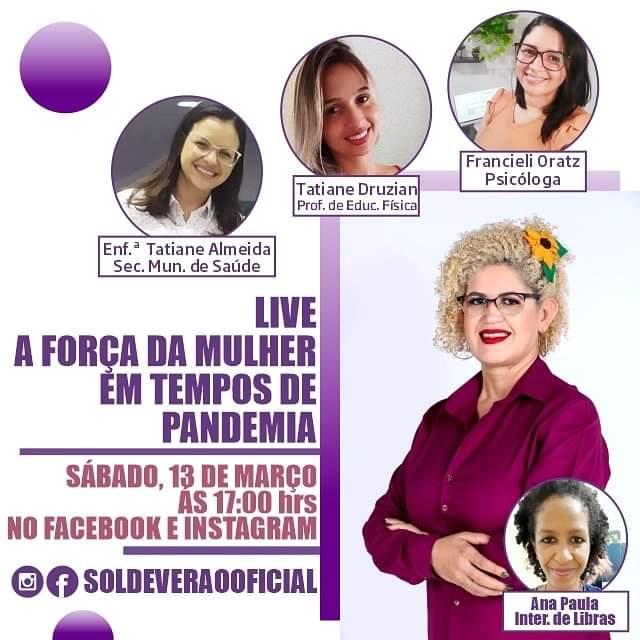 A Vereadora Sol de Verão convida todos para uma live que acontecerá neste sábado (13) às 17:00, com o tema ” A força da mulher em tempos de pandemia“!