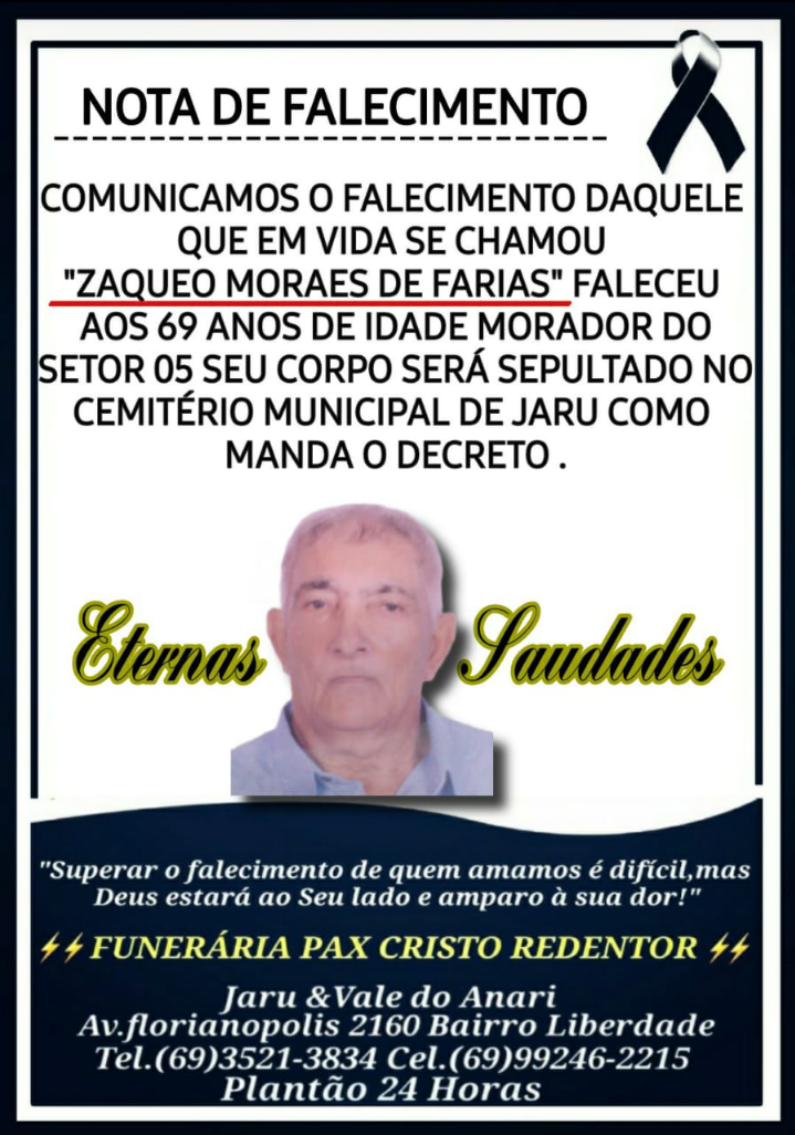 Zaqueo Moraes de Farias, 69 anos, faleceu nesta segunda-feira (22) no Hospital Municipal de Jaru vítima das complicações da Covid-19.