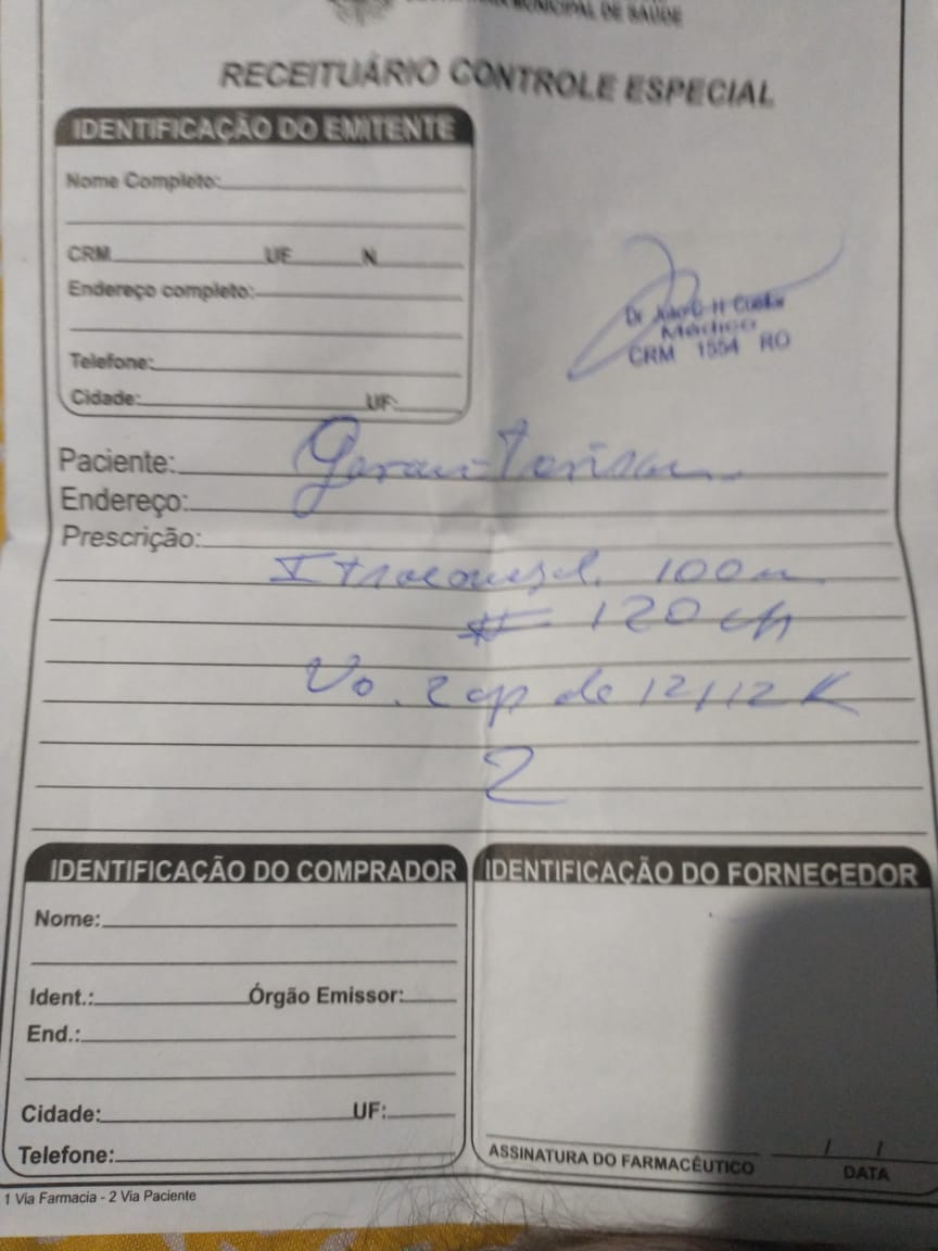 Geovani precisa de 120 comprimidos por mês de Itraconazol, a caixa é vendida com 15 comprimidos no valor aproximado de R$100,00.
