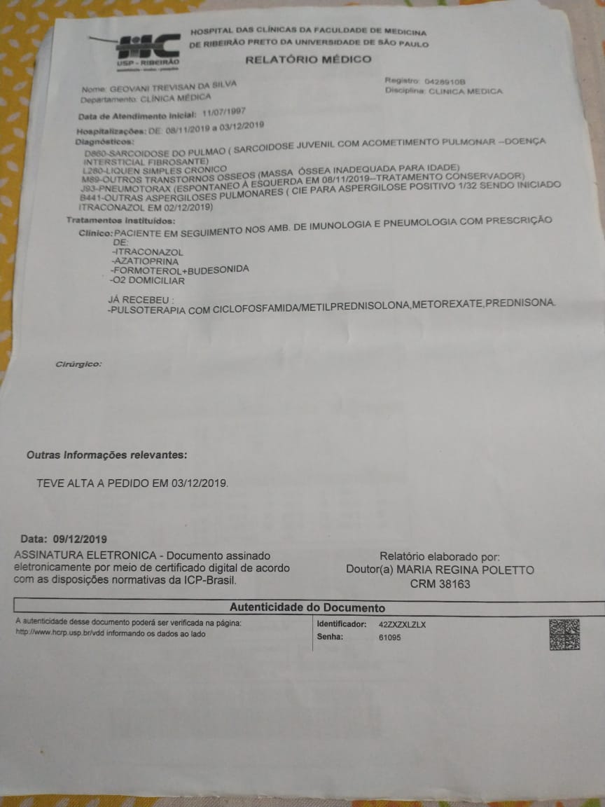 O jaruense Geovani Trevisan da Silva de 29 anos é portador de uma doença crônica conhecida como sarcoidose pulmonar e foi diagnosticado também com pneumotórax, enfermidade que também afeta o pulmão, devido a esta condição, Geovane necessita durante todo dia da assistência de um cilindro de oxigênio e faz uso desde fevereiro de 2020.