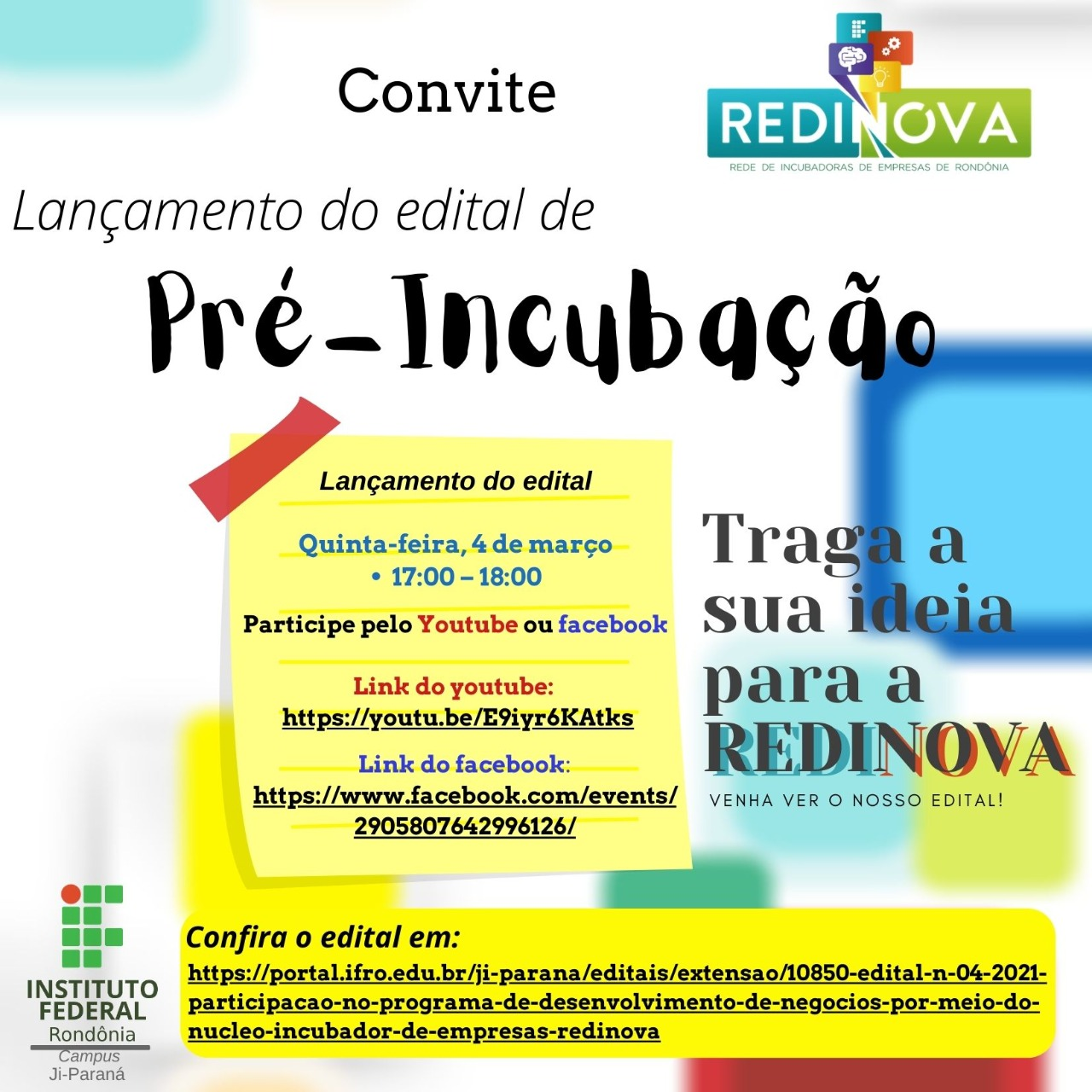 O Instituto Federal de Educação, Ciência e Tecnologia de Rondônia (IFRO), Campus Ji-Paraná, está aceitando inscrições até 30/3/2021 para a participação no Programa de Desenvolvimento de Negócios por meio do Núcleo Incubador de Empresas (Redinova). Uma live será realizada para repassar explicações sobre o processo de pré-incubação e sobre o edital aberto. O encontro virtual ocorre dia 4/3 (quinta-feira), às 17 horas, pelo link https://youtu.be/E9iyr6KAtks.