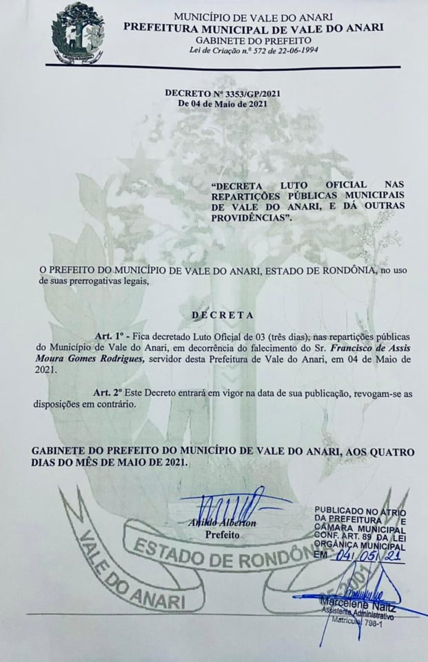 A Prefeitura Municipal de Vale do Anari publicou uma nota de pesar e decretou luto oficial de 3 dias.