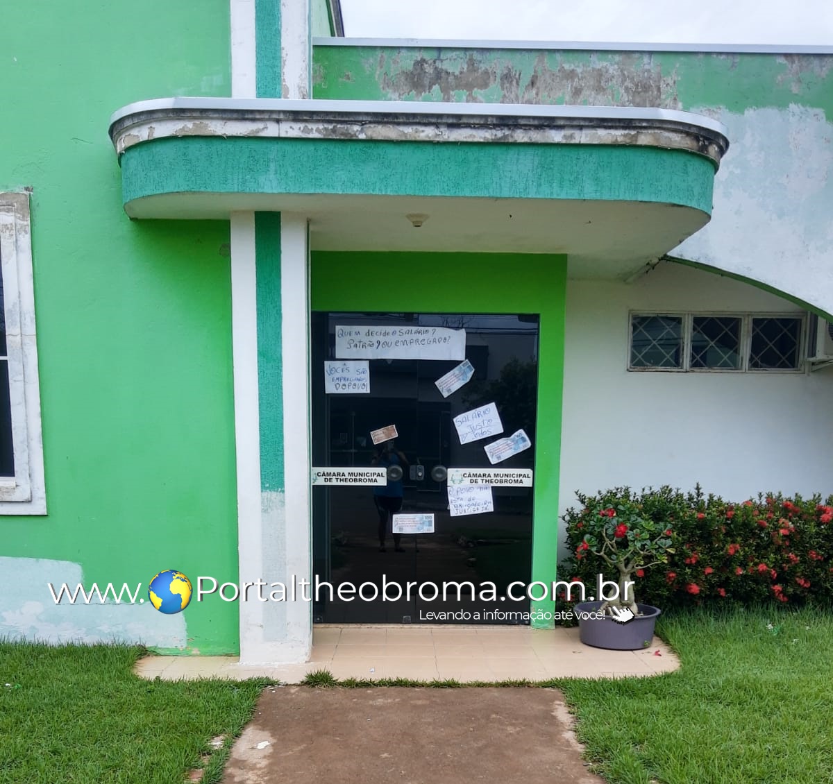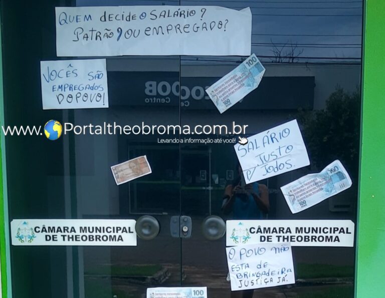 Nesta manhã de quarta-feira (27), a Câmara Municipal de Theobroma amanheceu com a porta da frente com vários cartazes cobrando explicações ao demais vereadores sobre a tão polemica do projeto de lei nº 007/GP/Gilmar/CMT/2020 de iniciativa do Legislativo, com a proposta de alterar os subsídios dos agentes políticos do município, lei que aumenta o salário dos vereadores, prefeito, vice prefeito, secretários e adjuntos para o próximo mandato.