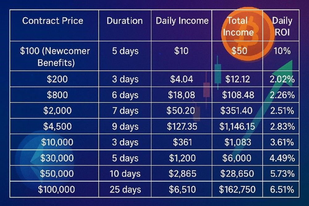 A plataforma oferece opções flexíveis de contrato, permitindo que os usuários façam upgrades de acordo com seus ativos e metas de renda, desbloqueando maior poder de mineração e melhores retornos.