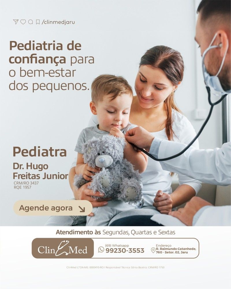 A Clin Med conta agora com médico especializado na área da Pediatria, atendendo no Município de Jaru, e você que precisa cuidar da saúde de sua criança, não perca tempo e nem deixe o cuidado com a saúde para último caso. Agende a sua consulta e garanta um atendimento com um profissional renomado que vai saber cuidar do que é mais precioso para você.