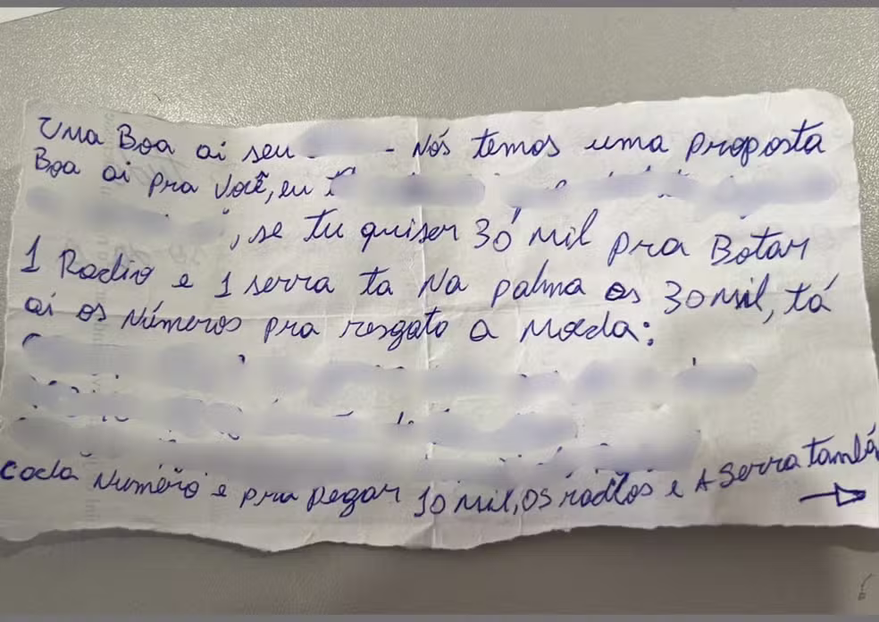 O bilhete também continha três nomes e números de telefone. A orientação era para que o policial entrasse em contato com cada pessoa, que repassaria R$ 10 mil, totalizando os R$ 30 mil.