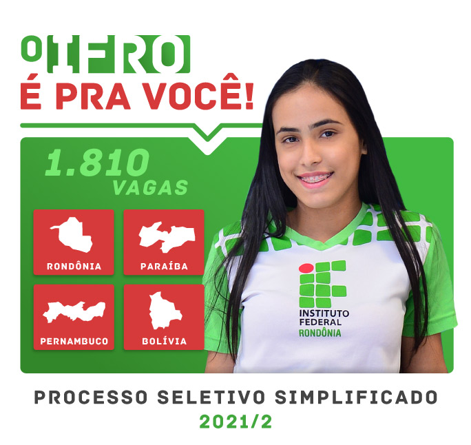 O Instituto Federal de Educação, Ciência e Tecnologia de Rondônia (IFRO) está com inscrições abertas no Processo Seletivo Simplificado (PSS 2021/2) para ingresso no 2º semestre de 2021. A seleção abrange os estados de Rondônia, Paraíba, Pernambuco e até a cidade de Guayaramerín na Bolívia. São ofertadas 1.810 vagas, distribuídas em 13 cursos, nas modalidades presencial e EaD, em três níveis de ensino: concomitante e subsequente ao ensino médio e graduação. Os interessados podem se inscrever até o dia 23 de junho de 2021.