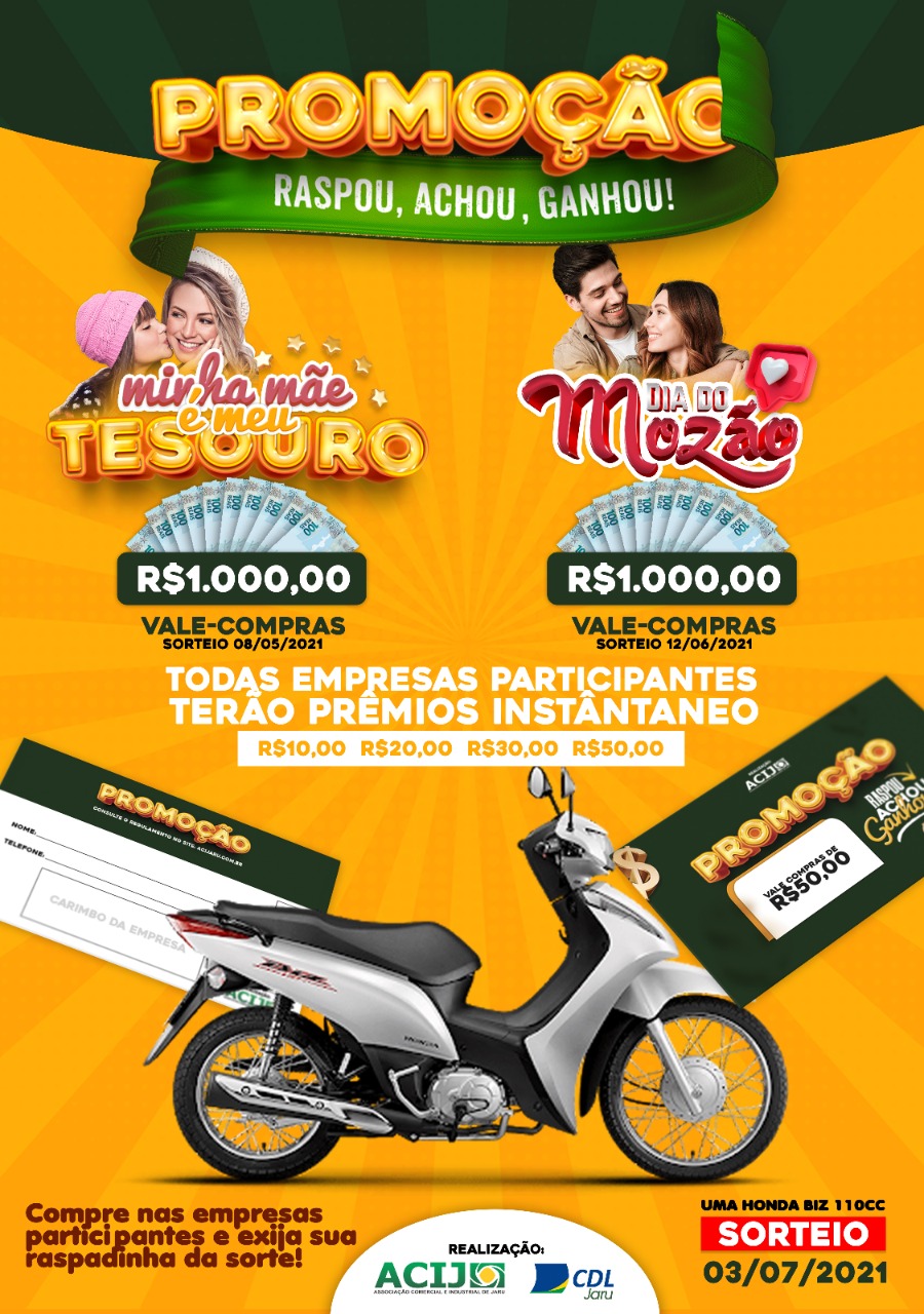 A promoção abordará duas datas comemorativas, mês das mães e dia dos namorados e as pessoas que preencherem o verso da raspadinha participarão de mais três sorteios: dia 08 de maio (MINHA MÃE É MEU TESOURO), prêmio: um vale-compras no valor de R$1.000,00; dia 12 de junho (DIA DO MOZÃO), prêmio: um vale-compras no valor de R$1.000,00 e para finalizar a campanha no dia 03 de julho haverá o sorteio final de uma HONDA BIZ 110cc 0km.