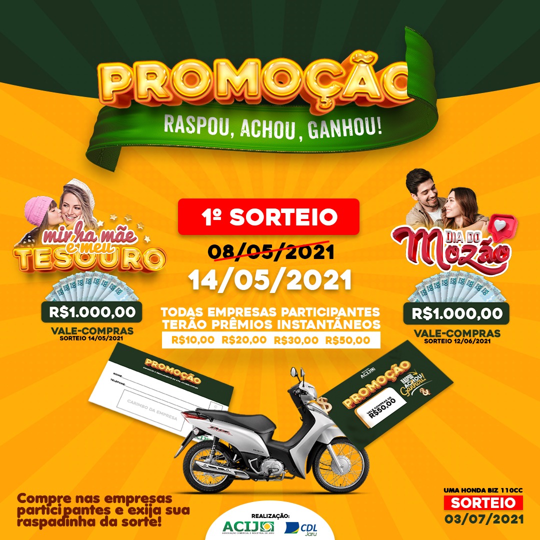 A ACIJ informa que prorrogou a data do primeiro sorteio da PROMOÇÃO RASPOU, ACHOU, GANHOU, que aconteceria no dia 08/05/2021 para 14/05/2021 sexta-feira as 16:00 horas no auditório da entidade.