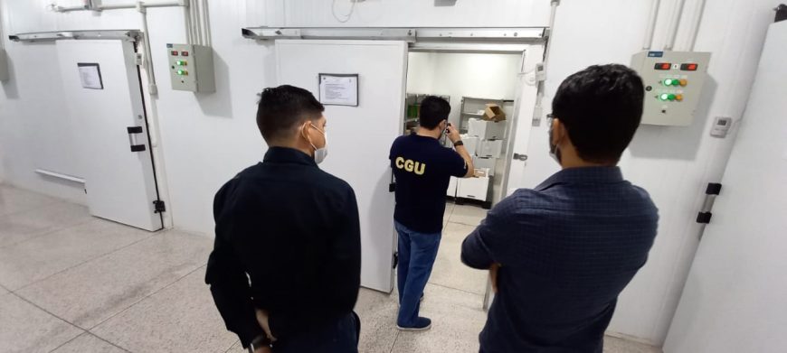O auditor federal juntamente com Paulo Eduardo, técnico federal de Finanças e Controle, visitaram desde a estrutura administrativa, o espaço destinado para armazenar os imunizantes, as câmaras frias e ainda, o almoxarifado, onde estão guardadas as seringas.