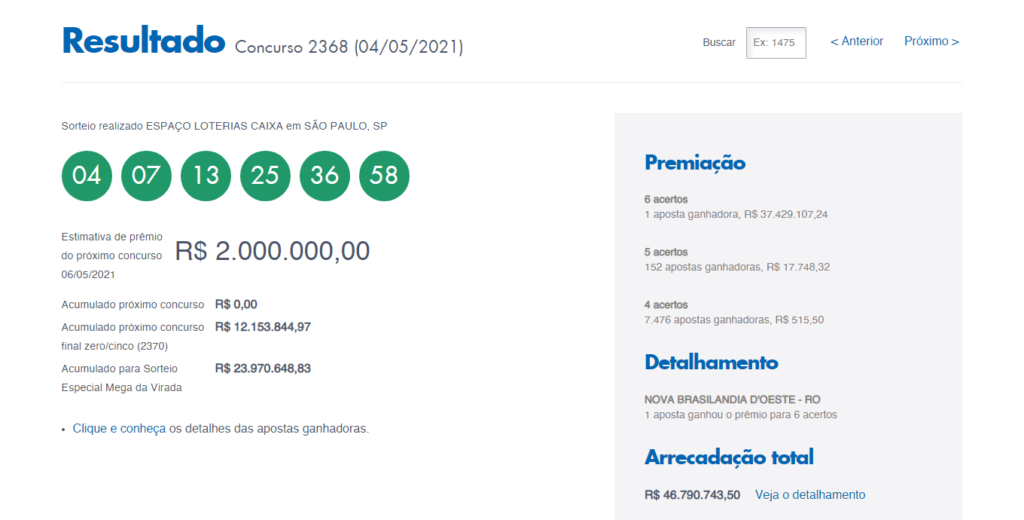 Ainda teve 152 apostas que acertaram a quina, ganhando R$ 17.748,32 cada. Também houve 7.476 bilhetes que acertaram a quadra. Eles embolsarão R$ 515,50.