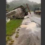 Caminhão com tanque de leite tomba na BR-364 na curva da Ceplac em Ouro Preto do Oeste ; vídeos