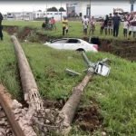 Motorista perde controle de carro, atinge poste e cai em vala em Vilhena, RO