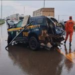 Viatura da PRF roda na pista e fica destruída após atingir carreta boiadeira na BR-364