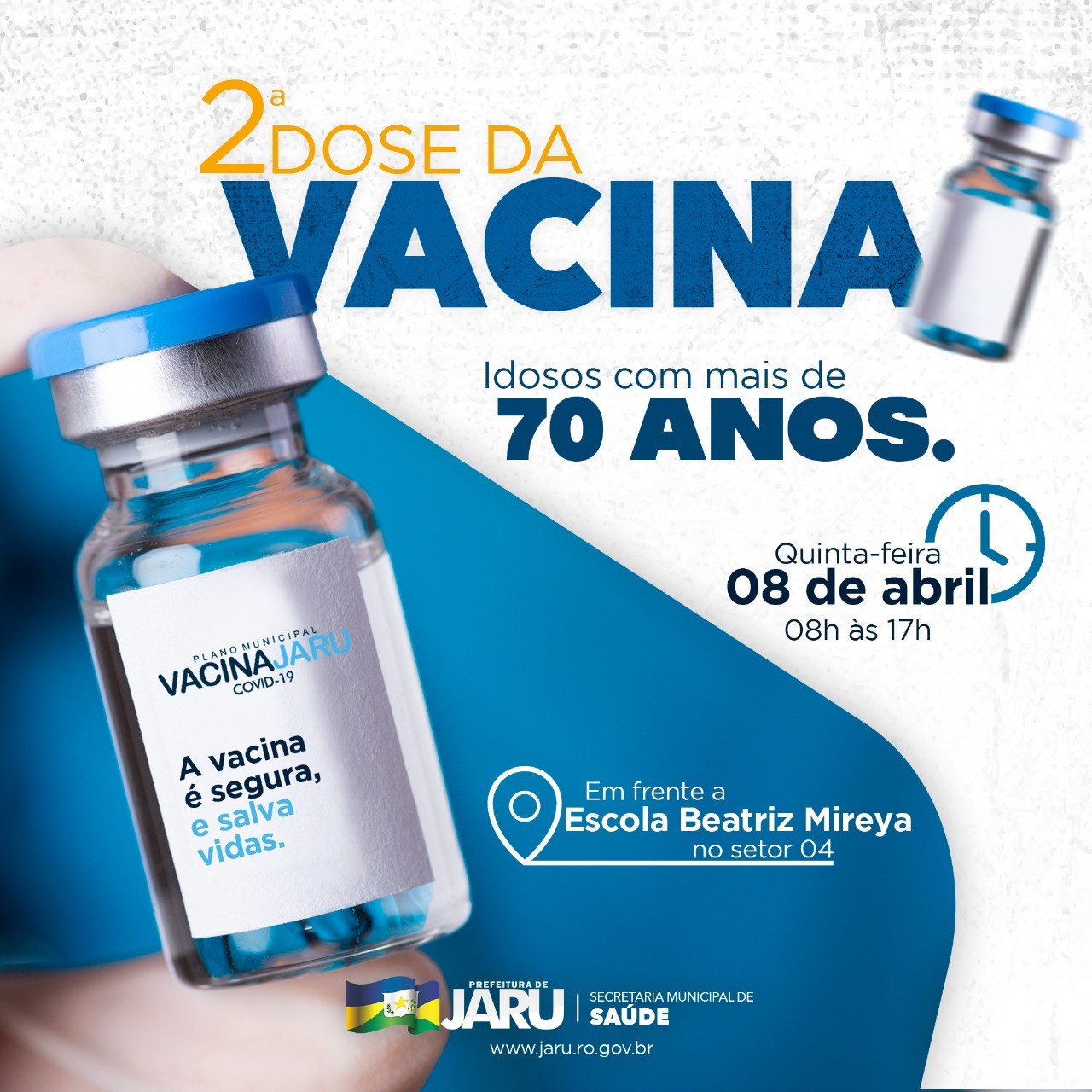 Nesta quinta-feira (08), será a vez de imunizar os idosos com mais de 70 anos de idade com a segunda dose da vacina contra o Coronavírus em Jaru.