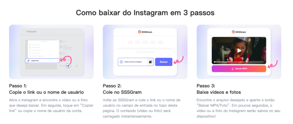 O SSSGram é uma plataforma online que rapidamente se tornou favorita entre os utilizadores que procuram uma forma rápida e fiável de guardar Destaques do Instagram ou baixar vídeo no Instagram. A sua interface baseada na web elimina a necessidade de instalar software ou criar uma conta, tornando-a acessível a qualquer pessoa com ligação à internet. Uma das suas características mais notáveis é a capacidade de preservar a qualidade em alta resolução, de modo que os seus Destaques ou vídeos guardados ficam exatamente como no Instagram. O SSSGram baixador do Instagram permite-te baixar vídeo no Instagram e descarregar histórias em alta qualidade, perfeitas para as desfrutarem a qualquer momento.